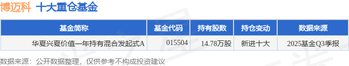 持有博迈科最多的基金为华夏兴夏价值一年持有混合发起式A,目前规模为0.61亿元,最新净值1.4552(10月31日),较上一交易日下跌0.05%,近一年上涨46.81%。该基金现任基金经理为朱熠 林瑶。