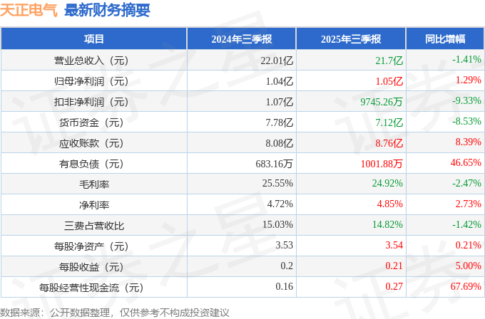 据证券之星公开数据整理,近期天正电气(605066)发布2025年三季报。截至本报告期末,公司营业总收入21.7亿元,同比下降1.41%,归母净利润1.05亿元,同比上升1.29%。按单季度数据看,第三季度营业总收入7.15亿元,同比上升6.69%,第三季度归母净利润2329.82万元,同比下降21.21%。本报告期天正电气公司应收账款体量较大,当期应收账款占最新年报归母净利润比达721.78%。