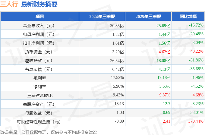 据证券之星公开数据整理,近期三人行(605168)发布2025年三季报。截至本报告期末,公司营业总收入25.69亿元,同比下降16.72%,归母净利润1.44亿元,同比下降20.48%。按单季度数据看,第三季度营业总收入9.12亿元,同比下降22.19%,第三季度归母净利润24.88万元,同比下降99.52%。本报告期三人行公司应收账款体量较大,当期应收账款占最新年报归母净利润比达1466.4%。