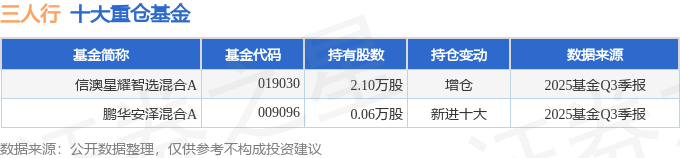 持有三人行最多的基金为信澳星耀智选混合A,目前规模为0.22亿元,最新净值1.4996(10月31日),较上一交易日上涨0.51%,近一年上涨42.16%。该基金现任基金经理为冯玺祥。