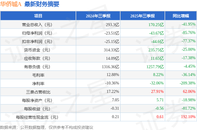 据证券之星公开数据整理,近期华侨城A(000069)发布2025年三季报。截至本报告期末,公司营业总收入170.25亿元,同比下降41.95%,归母净利润-43.67亿元,同比下降85.76%。按单季度数据看,第三季度营业总收入57.08亿元,同比下降9.67%,第三季度归母净利润-14.99亿元,同比下降15.79%。本报告期华侨城A三费占比上升明显,财务费用、销售费用和管理费用总和占总营收同比增幅达62.06%。