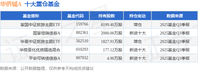 持有华侨城A最多的基金为富国中证旅游主题ETF,目前规模为49.27亿元,最新净值0.7353(10月31日),较上一交易日上涨1.04%,近一年上涨4.77%。该基金现任基金经理为曹璐迪。