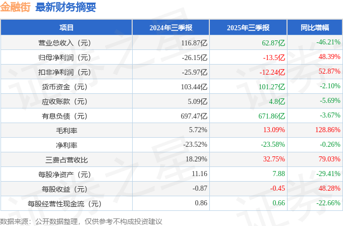 据证券之星公开数据整理,近期金融街(000402)发布2025年三季报。截至本报告期末,公司营业总收入62.87亿元,同比下降46.21%,归母净利润-13.5亿元,同比上升48.39%。按单季度数据看,第三季度营业总收入16.32亿元,同比下降19.69%,第三季度归母净利润-3.42亿元,同比上升45.84%。本报告期金融街三费占比上升明显,财务费用、销售费用和管理费用总和占总营收同比增幅达79.03%。