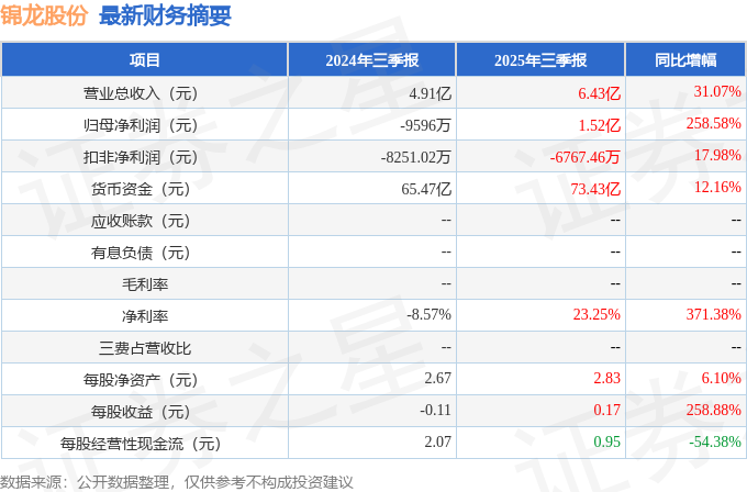 据证券之星公开数据整理,近期锦龙股份(000712)发布2025年三季报。根据财报显示,锦龙股份营收净利润同比双双增长。截至本报告期末,公司营业总收入6.43亿元,同比上升31.07%,归母净利润1.52亿元,同比上升258.58%。按单季度数据看,第三季度营业总收入2.26亿元,同比上升71.02%,第三季度归母净利润2732.39万元,同比上升160.89%。