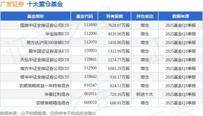 持有广发证券最多的基金为国泰中证全指证券公司ETF,目前规模为553.34亿元,最新净值1.2527(10月31日),较上一交易日下跌1.08%,近一年上涨11.72%。该基金现任基金经理为艾小军。
