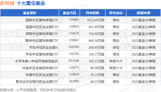 持有新希望最多的基金为国泰中证畜牧养殖ETF,目前规模为60.97亿元,最新净值0.6461(10月31日),较上一交易日上涨0.83%,近一年上涨10.2%。该基金现任基金经理为梁杏。