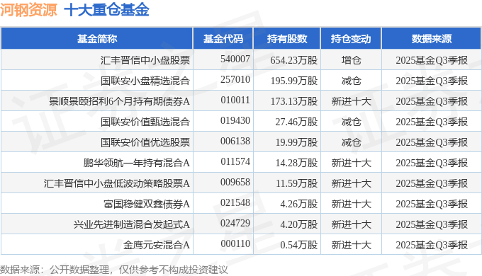 持有河钢资源最多的基金为汇丰晋信中小盘股票,目前规模为14.93亿元,最新净值3.4199(10月31日),较上一交易日下跌0.53%,近一年上涨39.37%。该基金现任基金经理为郑小兵。