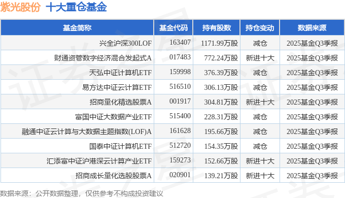 持有紫光股份最多的基金为兴全沪深300LOF,目前规模为51.36亿元,最新净值2.6933(10月31日),较上一交易日下跌0.96%,近一年上涨12.27%。该基金现任基金经理为申庆。