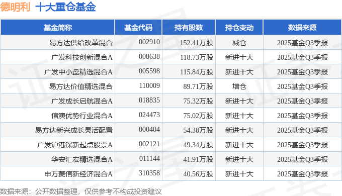 持有德明利最多的基金为易方达供给改革混合,目前规模为31.19亿元,最新净值3.4032(10月31日),较上一交易日下跌1.33%,近一年上涨34.01%。该基金现任基金经理为杨宗昌。