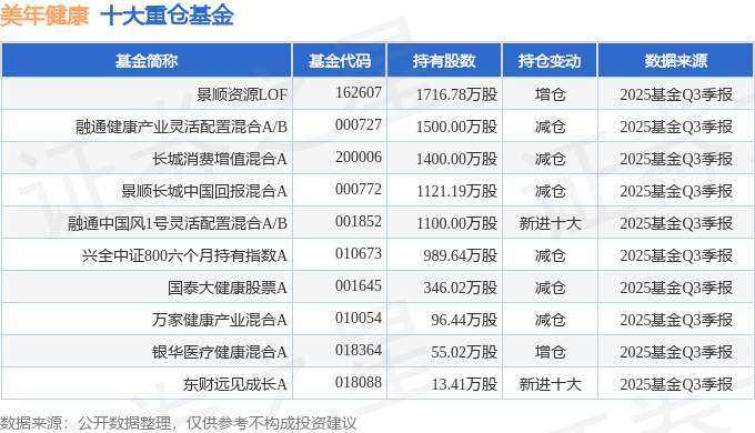 持有美年健康最多的基金为景顺资源LOF,目前规模为17.52亿元,最新净值0.538(10月31日),较上一交易日上涨0.56%,近一年上涨22.43%。该基金现任基金经理为韩文强。