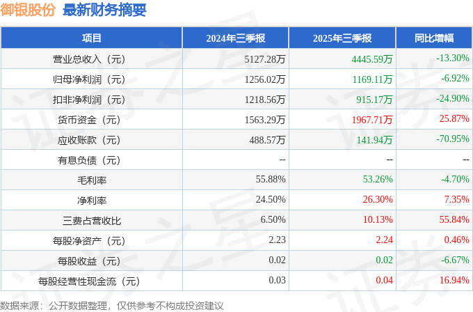 据证券之星公开数据整理,近期御银股份(002177)发布2025年三季报。截至本报告期末,公司营业总收入4445.59万元,同比下降13.3%,归母净利润1169.11万元,同比下降6.92%。按单季度数据看,第三季度营业总收入1484.31万元,同比下降14.26%,第三季度归母净利润107.12万元,同比下降63.61%。本报告期御银股份三费占比上升明显,财务费用、销售费用和管理费用总和占总营收同比增幅达55.84%。