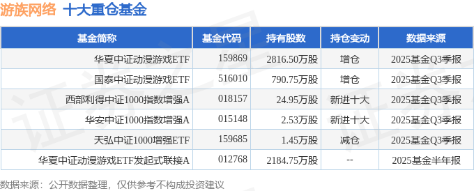 持有游族网络最多的基金为华夏中证动漫游戏ETF,目前规模为106.97亿元,最新净值1.4277(10月31日),较上一交易日上涨0.85%,近一年上涨38.56%。该基金现任基金经理为鲁亚运。