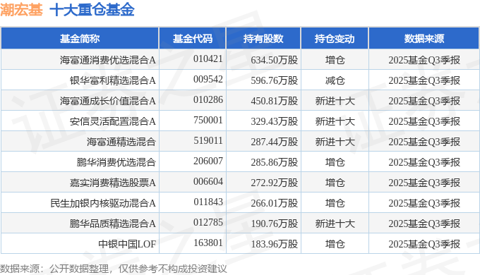 持有潮宏基最多的基金为海富通消费优选混合A,目前规模为3.27亿元,最新净值1.4503(10月30日),较上一交易日下跌1.4%,近一年上涨86.03%。该基金现任基金经理为刘海啸。