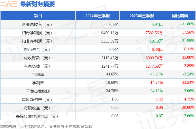 据证券之星公开数据整理,近期二六三(002467)发布2025年三季报。截至本报告期末,公司营业总收入5.91亿元,同比下降11.86%,归母净利润7582.56万元,同比上升17.56%。按单季度数据看,第三季度营业总收入2.06亿元,同比上升2.14%,第三季度归母净利润4000.55万元,同比上升203.2%。本报告期二六三应收账款上升,应收账款同比增幅达35.08%。