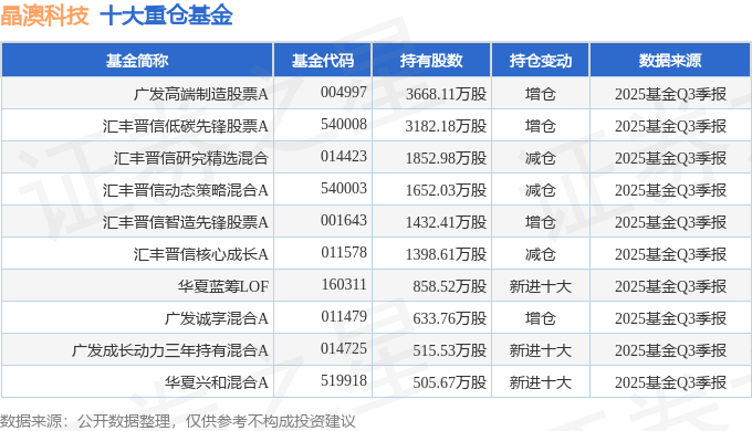 持有晶澳科技最多的基金为广发高端制造股票A,目前规模为44.24亿元,最新净值1.4879(10月30日),较上一交易日上涨0.92%,近一年下跌5.93%。该基金现任基金经理为郑澄然。