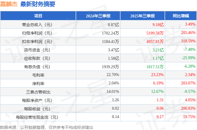 据证券之星公开数据整理,近期嘉麟杰(002486)发布2025年三季报。截至本报告期末,公司营业总收入9.18亿元,同比上升3.49%,归母净利润5199.58万元,同比上升205.46%。按单季度数据看,第三季度营业总收入3.02亿元,同比上升2.6%,第三季度归母净利润2224.69万元,同比上升451.31%。本报告期嘉麟杰盈利能力上升,毛利率同比增幅2.34%,净利率同比增幅203.07%。