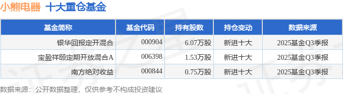 持有小熊电器最多的基金为银华回报定开混合,目前规模为1.15亿元,最新净值1.704(10月31日),较上一交易日上涨0.41%,近一年上涨24.87%。该基金现任基金经理为周晶。