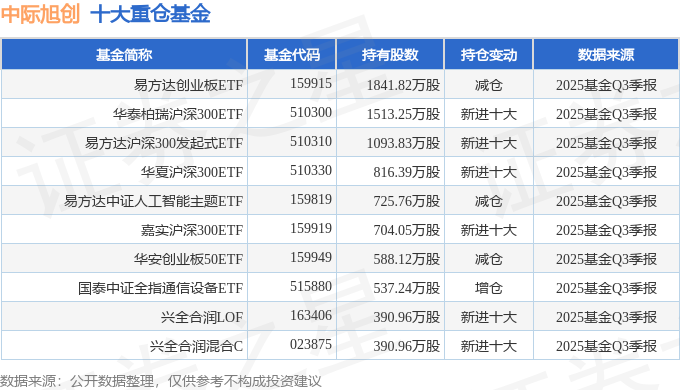 持有中际旭创最多的基金为易方达创业板ETF,目前规模为102.0亿元,最新净值3.1644(10月31日),较上一交易日下跌2.32%,近一年上涨53.47%。该基金现任基金经理为成曦 刘树荣。