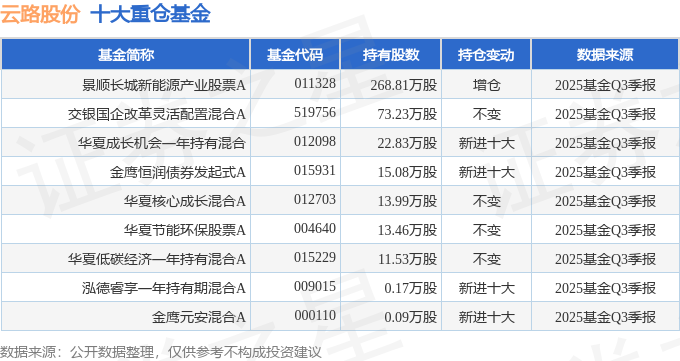 持有云路股份最多的基金为景顺长城新能源产业股票A,目前规模为24.68亿元,最新净值1.4866(10月30日),较上一交易日下跌0.75%,近一年上涨38.28%。该基金现任基金经理为杨锐文 曾英捷。