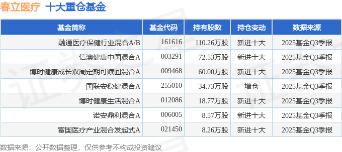 持有春立医疗最多的基金为融通医疗保健行业混合A/B,目前规模为7.08亿元,最新净值1.735(10月31日),较上一交易日上涨1.58%,近一年上涨8.38%。该基金现任基金经理为万民远 刘曦阳。