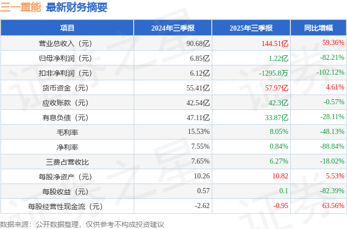 据证券之星公开数据整理,近期三一重能(688349)发布2025年三季报。截至本报告期末,公司营业总收入144.51亿元,同比上升59.36%,归母净利润1.22亿元,同比下降82.21%。按单季度数据看,第三季度营业总收入58.57亿元,同比上升54.64%,第三季度归母净利润-8827.5万元,同比下降135.13%。本报告期三一重能存货明显上升,存货同比增幅达52.01%。