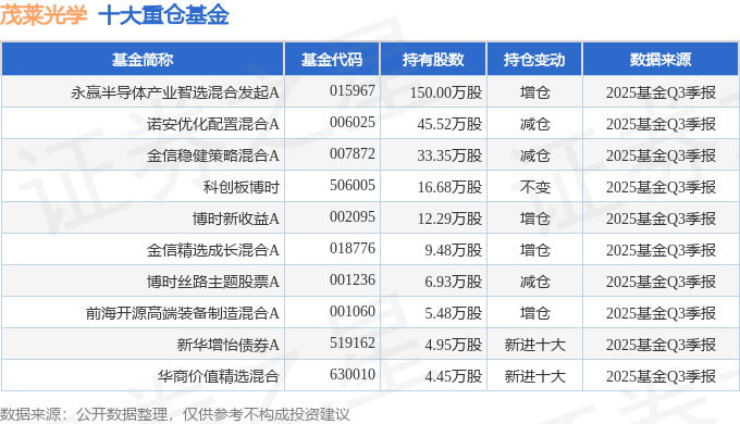 持有茂莱光学最多的基金为永赢半导体产业智选混合发起A,目前规模为8.58亿元,最新净值1.6569(10月31日),较上一交易日下跌2.81%,近一年上涨62.11%。该基金现任基金经理为张海啸。