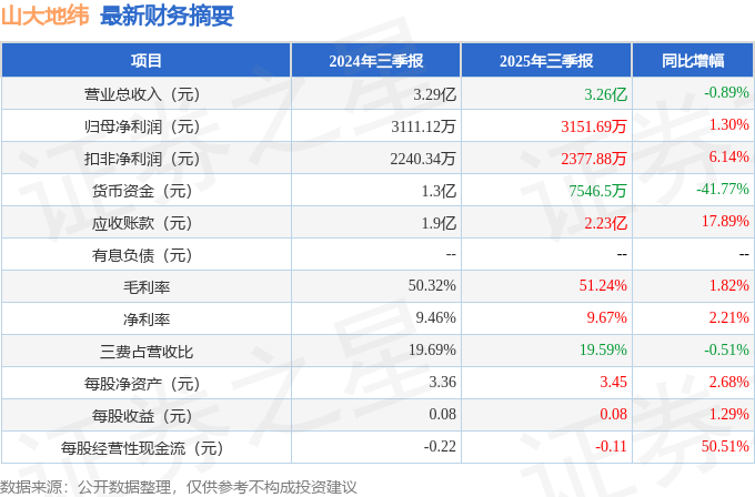 据证券之星公开数据整理,近期山大地纬(688579)发布2025年三季报。截至本报告期末,公司营业总收入3.26亿元,同比下降0.89%,归母净利润3151.69万元,同比上升1.3%。按单季度数据看,第三季度营业总收入1.17亿元,同比下降3.2%,第三季度归母净利润1174.22万元,同比上升14.49%。本报告期山大地纬盈利能力上升,毛利率同比增幅1.82%,净利率同比增幅2.21%。