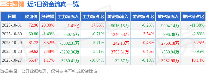 证券之星消息,截至2025年10月31日收盘,三生国健(688336)报收于72.96元,上涨20.0%,涨停,换手率1.87%,成交量11.52万手,成交额7.99亿元。