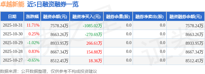 卓越新能融资融券信息显示,融资方面,当日融资买入1124.78万元,融资偿还2209.8万元,融资净偿还1085.02万元。融券方面,融券卖出0.0股,融券偿还0.0股,融券余量0.0股,融券余额0.0万元。融资融券余额7578.24万元。