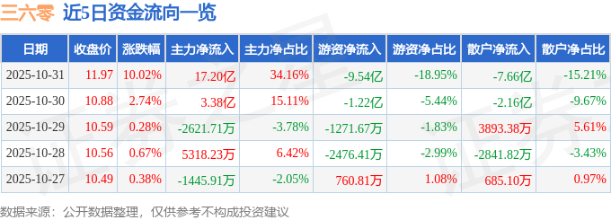 证券之星消息,截至2025年10月31日收盘,三六零(601360)报收于11.97元,上涨10.02%,涨停,换手率6.12%,成交量428.61万手,成交额50.36亿元。