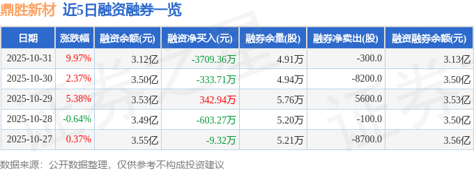 证券之星消息,截至2025年10月31日收盘,鼎胜新材(603876)报收于12.8元,上涨9.97%,涨停,换手率9.75%,成交量90.61万手,成交额11.56亿元。
