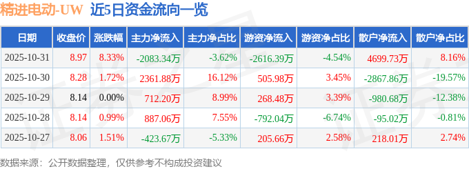 证券之星消息,截至2025年10月31日收盘,精进电动(688280)报收于8.97元,上涨8.33%,换手率11.89%,成交量61.91万手,成交额5.76亿元。