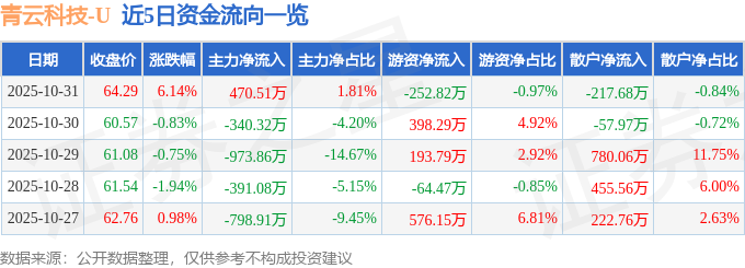 证券之星消息,截至2025年10月31日收盘,青云科技(688316)报收于64.29元,上涨6.14%,换手率8.47%,成交量4.06万手,成交额2.61亿元。