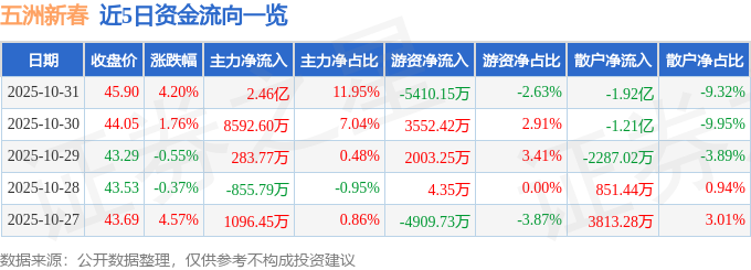 证券之星消息,截至2025年10月31日收盘,五洲新春(603667)报收于45.9元,上涨4.2%,换手率12.22%,成交量44.74万手,成交额20.58亿元。