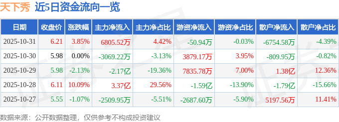 证券之星消息,截至2025年10月31日收盘,天下秀(600556)报收于6.21元,上涨3.85%,换手率13.67%,成交量247.12万手,成交额15.4亿元。