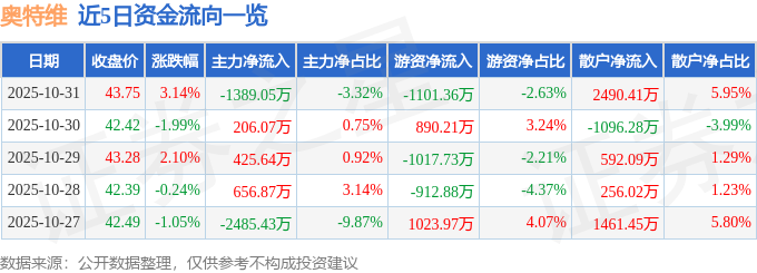 10月31日的资金流向数据方面,主力资金净流出1389.05万元,占总成交额3.32%,游资资金净流出1101.36万元,占总成交额2.63%,散户资金净流入2490.41万元,占总成交额5.95%。