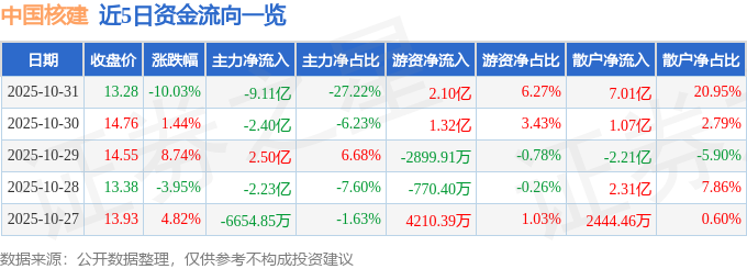 证券之星消息,截至2025年10月31日收盘,中国核建(601611)报收于13.28元,下跌10.03%,跌停,换手率8.17%,成交量246.23万手,成交额33.45亿元。