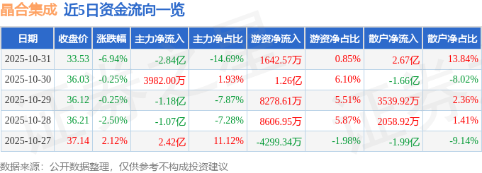 证券之星消息,截至2025年10月31日收盘,晶合集成(688249)报收于33.53元,下跌6.94%,换手率4.74%,成交量56.29万手,成交额19.31亿元。