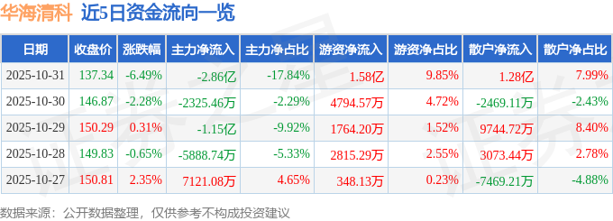 证券之星消息,截至2025年10月31日收盘,华海清科(688120)报收于137.34元,下跌6.49%,换手率3.26%,成交量11.53万手,成交额16.04亿元。