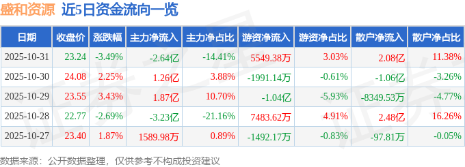 证券之星消息,截至2025年10月31日收盘,盛和资源(600392)报收于23.24元,下跌3.49%,换手率4.47%,成交量78.31万手,成交额18.31亿元。