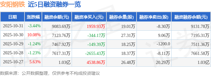 证券之星消息,截至2025年10月31日收盘,安阳钢铁(600569)报收于2.53元,下跌3.44%,换手率7.57%,成交量217.49万手,成交额5.67亿元。
