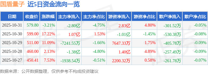 证券之星消息,截至2025年10月31日收盘,国盾量子(688027)报收于579.8元,下跌3.21%,换手率12.44%,成交量10.0万手,成交额58.97亿元。