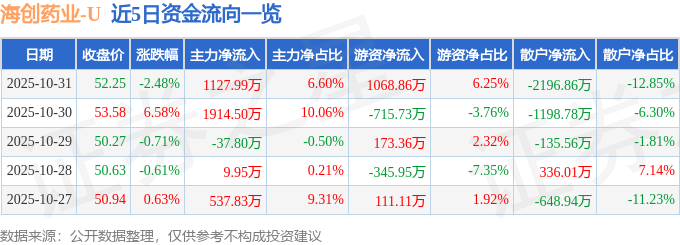 证券之星消息,截至2025年10月31日收盘,海创药业(688302)报收于52.25元,下跌2.48%,换手率3.4%,成交量3.36万手,成交额1.71亿元。