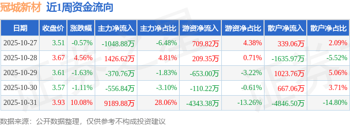 资金流向数据方面,本周冠城新材主力资金合计净流入8640.01万元,游资资金合计净流出4187.43万元,散户资金合计净流出4452.59万元。本周资金流向一览见下表: