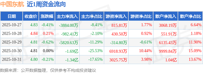 资金流向数据方面,本周中国东航主力资金合计净流出4.1亿元,游资资金合计净流入1.09亿元,散户资金合计净流入3.02亿元。本周资金流向一览见下表: