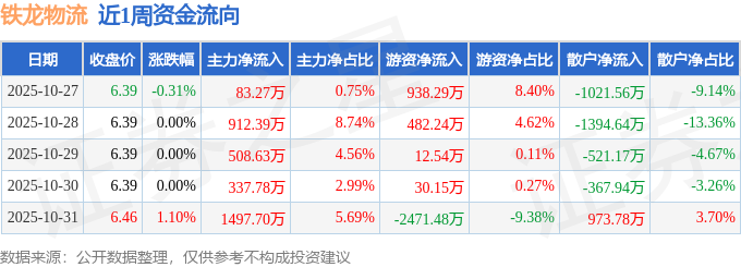 资金流向数据方面,本周铁龙物流主力资金合计净流入3339.78万元,游资资金合计净流出1008.26万元,散户资金合计净流出2331.52万元。本周资金流向一览见下表: