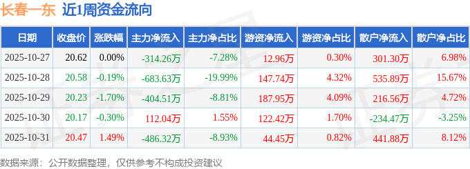 资金流向数据方面,本周长春一东主力资金合计净流出1776.68万元,游资资金合计净流入515.52万元,散户资金合计净流入1261.16万元。本周资金流向一览见下表: