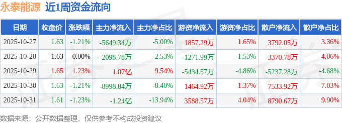 资金流向数据方面,本周永泰能源主力资金合计净流出1.85亿元,游资资金合计净流入204.22万元,散户资金合计净流入1.83亿元。本周资金流向一览见下表: