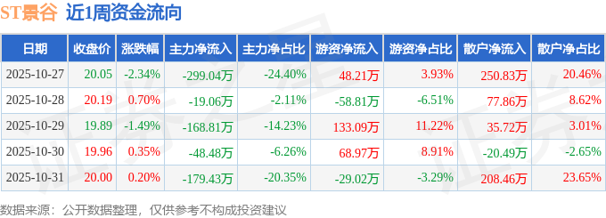 资金流向数据方面,本周ST景谷主力资金合计净流出714.82万元,游资资金合计净流入162.44万元,散户资金合计净流入552.38万元。本周资金流向一览见下表: