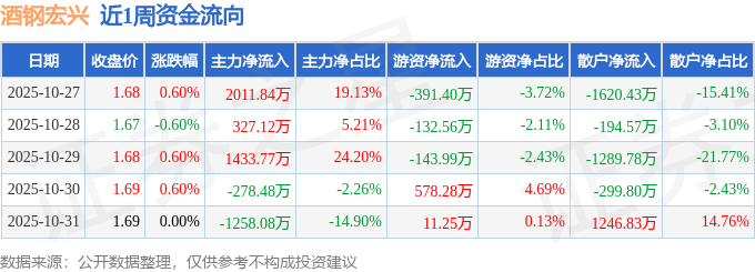 沪深股通持股方面,截止2025年10月31日收盘,酒钢宏兴沪股通持股数为1663.52万股,占流通股比为27.0%。